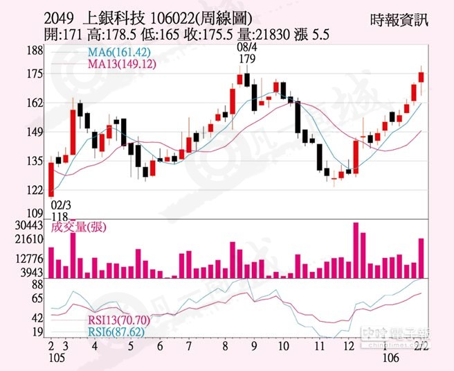 上銀(2049)因景氣好轉、大陸對智慧自動化及機器人需求持續(xù)升溫,滾珠螺桿、直線導軌及機器人等三大主力產(chǎn)品首季訂單滿載,訂單能見度看到4、5月,元月營收創(chuàng)同期次高,上周五吸引外資及自營商合計買超1,971張,推升股價上漲3.5元、收175.5元,單周漲幅3.24%。