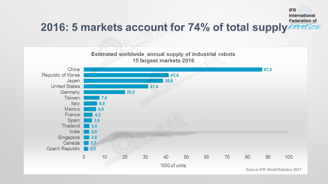 機器人行業增長最快的是亞洲-其中以中國這個現為世界第一的市場領先。在2017年,亞太-澳洲地區的機器人裝置估計增長了21%。美洲地區的機器人供應將增長16%,歐洲增長8%。這一發展的重要推動力是:為因應更快速的商業循環,以及所有制造行業的客戶都要求更大生產彈性與客制化,而采用機器人。新一代工業機器人將為更加靈活的自動化鋪路。