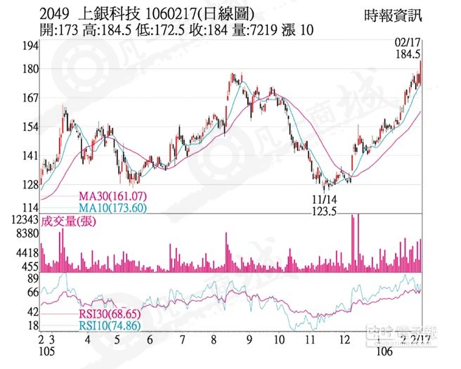 上銀大廠(2049)拜大陸對智慧自動化及工業(yè)用機(jī)器人需求持續(xù)暢旺所賜,上半年訂單滿手,2月持續(xù)加班趕工,市場預(yù)期2月營收超越去年同期8.45億元,上看10億元,外資及自營商17日合計(jì)買超3,888張,推升股價以184元作收,上漲10元,創(chuàng)2015年11月以來新高。