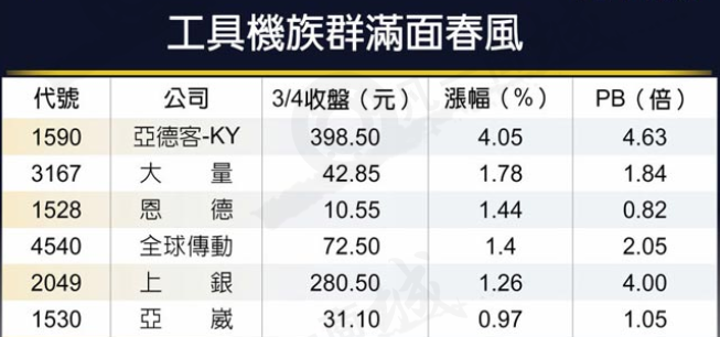 中美貿(mào)易談判樂觀,可望在3月底習(xí)川會(huì)簽成協(xié)議,為周一(4日)登場的「2019年臺北國際工具機(jī)展」增添大利多,亞德客、上銀等相關(guān)概念股滿面春風(fēng),搭配工具機(jī)搶攻自動(dòng)化概念商機(jī)發(fā)酵,買氣逐步歸隊(duì),全年?duì)I運(yùn)有望先蹲后跳。