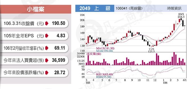上銀科技(2049)今年對上銀滾珠螺桿、上銀直線導(dǎo)軌及機(jī)器人三大主力產(chǎn)品需求增溫,從去年第1季末到第2季初旺到現(xiàn)在,上半年訂單滿爆,生產(chǎn)線加班趕工,1至2月合并營收26.98億元,年增45.95%,擔(dān)心工具機(jī)廠重復(fù)下單,下半年轉(zhuǎn)趨謹(jǐn)慎,務(wù)實(shí)接單,全年合并營收有機(jī)會(huì)續(xù)創(chuàng)新高。