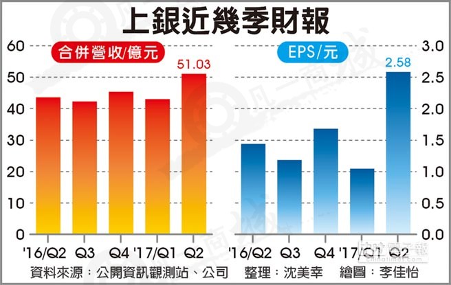 上銀董事會承認上半年財報,第2季合并營收51.03億元,營業毛利17.46億元,毛利率從去年同期的34.19%提高至34.23%,主要是產能利用率提升及第2季產品漲價,加上認列1.3億元匯兌收益,推升稅前凈利至8.31億元、稅后凈利6.29億元,EPS從去年同期的1.44元回升至2.58元,季增148.08%,年增79.17%。
