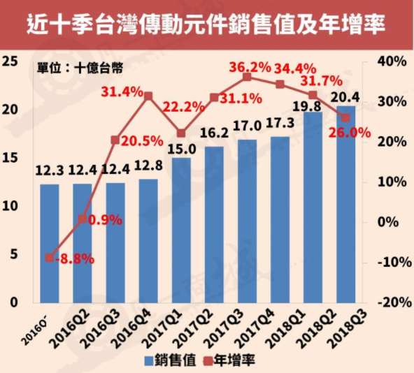 臺(tái)灣 2017 年生產(chǎn)傳動(dòng)組件的年產(chǎn)值已經(jīng)突破 600 億臺(tái)幣!其中超過七成的產(chǎn)值來自外銷!且滾珠絲桿之產(chǎn)值已列為全球第四。直線導(dǎo)軌與滾珠絲桿主要外銷區(qū)域?yàn)橹袊⒛享n、德國、日本,所以傳動(dòng)組件產(chǎn)業(yè)是一個(gè)很典型的出口導(dǎo)向行業(yè)。另外,我們也注意到每一季的年增率相當(dāng)驚人,已經(jīng)連續(xù) 8 季有超過 20% 的成長(zhǎng)率!