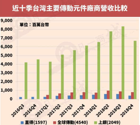 上銀在去年度第三季的營收已經(jīng)突破 80 億臺(tái)幣;而全球傳動(dòng)是在去年第二季創(chuàng)下接近 10 億營收的新高;最后,直得近兩季的營收大約都接近 6 億元。