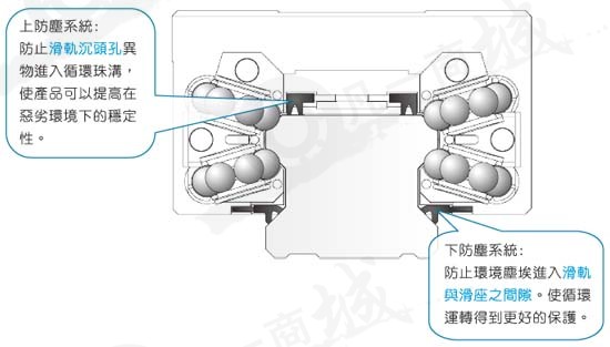 上防塵系統(tǒng):上防塵系統(tǒng)即是針對滑軌沉頭固定孔之塵埃作防塵動作,上防塵即利用橡膠刮刷片,使滑軌上沉頭固定孔之塵埃,無法進(jìn)入循環(huán)珠溝,使上排珠的循環(huán)異物問題更加減少。
