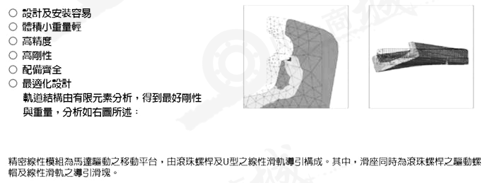 2)體積小重量輕: U型軌道可當(dāng)導(dǎo)引軌道,亦用搭平臺(tái)結(jié)構(gòu),大幅縮小安裝體積,并以有限元素法設(shè)計(jì)出最佳化結(jié)構(gòu),得到最佳剛性與重量比例。低扭力與低慣量的平順定位運(yùn)動(dòng),可減少能源耗用。