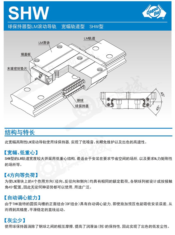 (寬幅低重心):SHW型的LM軌道寬度較大并采用低重心結(jié)構(gòu),最適合安裝在要求節(jié)省空間的場所,以及要求M力矩剛性的場所的等