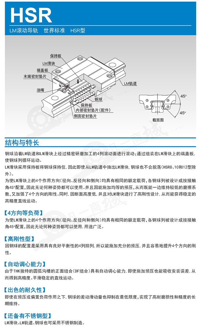 在LM軌道與LM滑塊的被精密研磨加工過的4列滾動溝槽上球進行滾動,再通過裝在LM滑塊上的端蓋板,使各列球進行循環運動。 因球被保持板保持,即使將LM 滑塊從LM 軌道上抽出,球也不會脫落。(HSR8 , 10 , 12 型除外)。 為了使LM 滑塊的4 個方向(徑向方向、反徑向方向、橫方向)具有相同的額定負荷,各球列被設計成45 °的接觸角,無論使用何種姿勢都可以。并且因能施加均等的預壓,從而既能一邊維持較低的摩擦系數,又加強了4個方向的剛性。同時、因斷面高度低、且對LM滑塊進行了高剛性設計,因而可以獲得穩定的高精度直線運動。