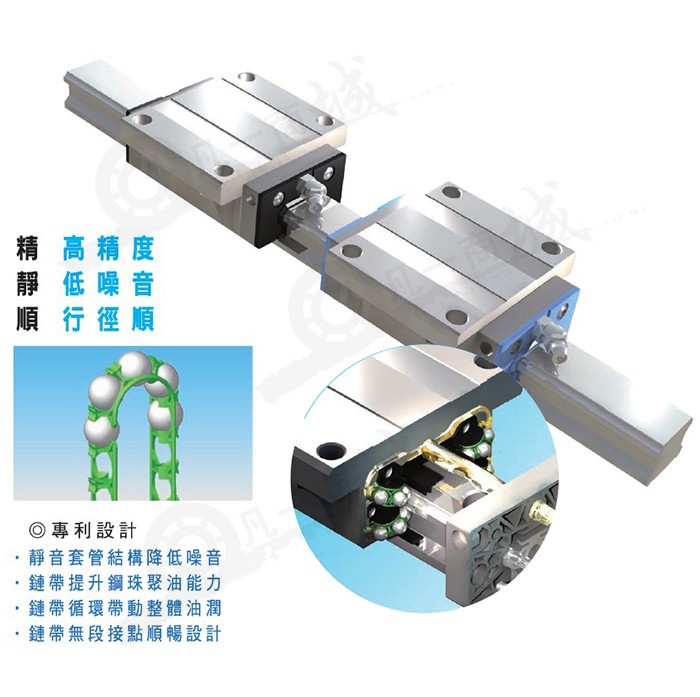 STAF導軌具有高精度、低噪音、導程平順三大特點,擁有多項發明專利:靜音套管設計,鏈帶提升鋼珠聚油能力,循環鏈帶提升由潤均勻分布,